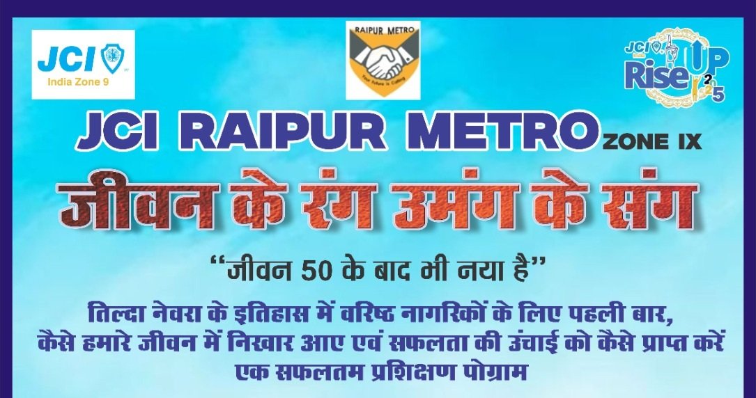तिल्दा नेवरा (रायपुर) ।–जेसीआई इंडिया ज़ोन 9 के अंतर्गत जेसीआई रायपुर मेट्रो द्वारा एक अनोखे और प्रेरणादायक कार्यक्रम “Rise Up 5” का आयोजन 13 सितंबर 2025, शनिवार को किया जा रहा है। यह कार्यक्रम वरिष्ठ नागरिकों के लिए तिल्दा नेवरा के इतिहास में पहली बार आयोजित किया जा रहा है, जिसकी थीम है: “जीवन 50 के बाद भी नया है”।