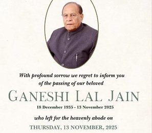 -श्री जैन ने अपने जीवन में सरलता, सेवा और परिवारिक मूल्यों को सर्वोपरि रखा- नई दिल्ली/छत्तीसगढ़।जैन समुदाय के सम्मानित वरिष्ठ सदस्य व महक ग्रुप के चेयरमैनउद्योगपति श्री गणेशीलाल जैन जी (18 दिसंबर 1935 – 13 नवंबर 2025) के निधन से समाज व परिवारजनों में गहरा शोक व्याप्त है।
