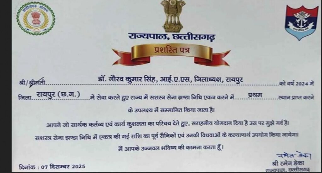 रायपुर। सशस्त्र सेना झंडा दिवस कोष के लिए इस वर्ष सबसे अधिक धनराशि जुटाने वाले जिले के रूप में रायपुर ने राज्य में पहला स्थान हासिल किया है। राज्यपाल रमेन डेका ने कलेक्टर डॉ. गौरव सिंह को 18 लाख रुपये के रिकॉर्ड संग्रह के लिए सम्मानित किया। राज्यपाल ने कहा कि यह उपलब्धि नागरिकों की देशभक्ति और सैन्य परिवारों के प्रति गहरी संवेदनशीलता को दर्शाती है। जिले की यह सफलता झंडा दिवस अभियान को नई ऊर्जा देने वाली मानी जा रही है।