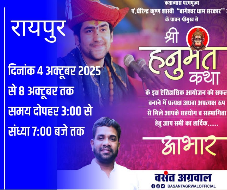रायपुर। बागेश्वर धाम पीठाधीश्वर पूज्य पं. धीरेंद्र कृष्ण शास्त्री 4 से 8 अक्टूबर तक श्री हनुमंत कथा के लिए रायपुर आ रहे हैं। आयोजन स्थल अवधपुरी मैदान, श्रीनगर रोड, गुढियारी रहेगा, और यह आयोजन स्व. श्री पुरुषोत्तम अग्रवाल स्मृति फाउंडेशन के तत्वावधान में हो रहा है, जिसकी अगुवाई युवा समाजसेवी चंदन – बसंत अग्रवाल (थान खम्हरिया वाले) कर रहे हैं।