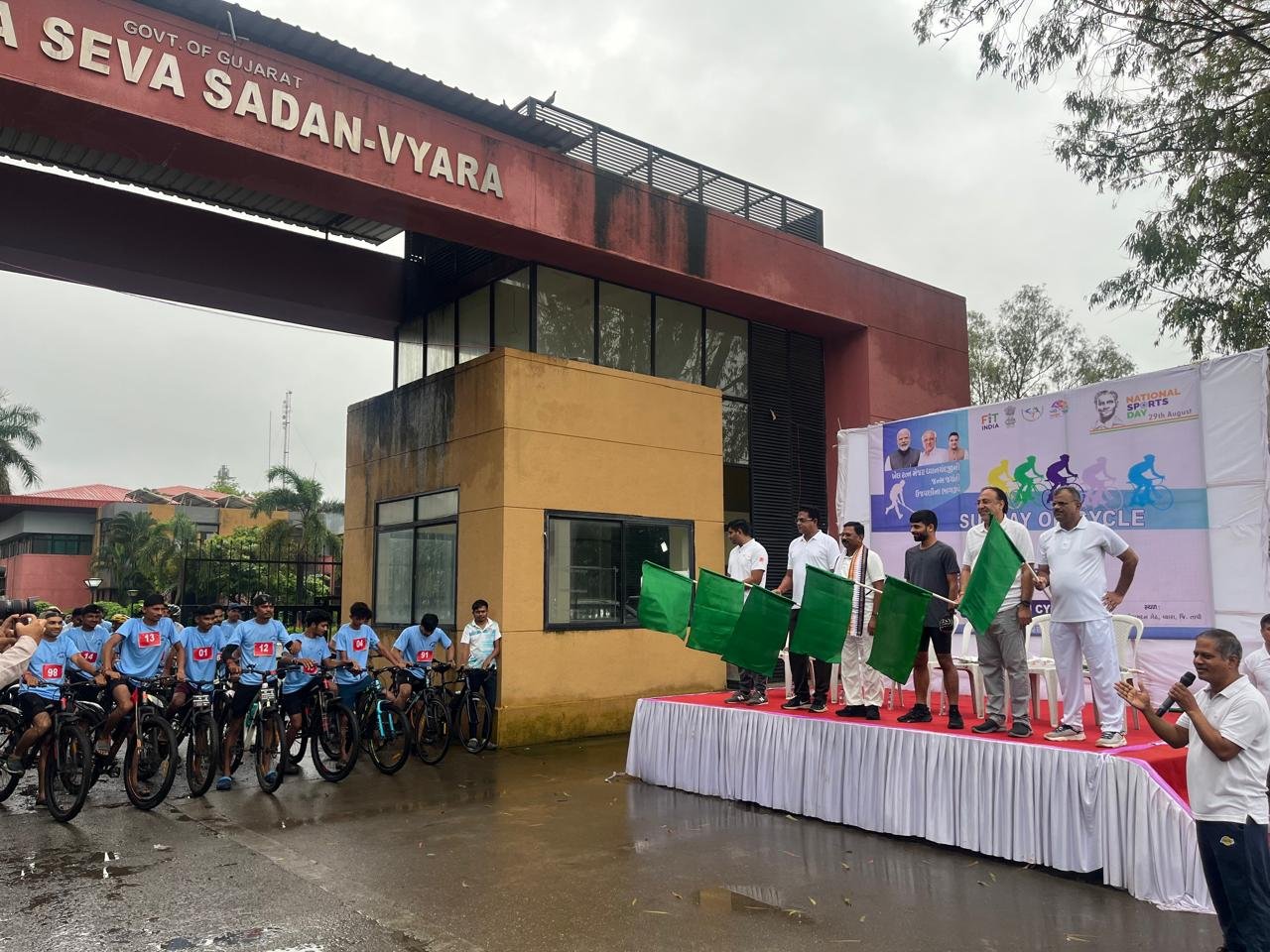 गुजरात। हॉकी के जादूगर मेजर ध्यानचंदजी की जयंती 29 अगस्त 2025 के अवसर पर तापी जिले में राष्ट्रीय खेल दिवस उत्साह के साथ मनाया गया। राष्ट्रीय खेल दिवस के तीन दिवसीय समारोह के अंतिम दिन यानि 31 अगस्त को सांसद प्रभु वसावा ने जिला सेवा सदन के पाटणगंण में सन डे ऑन साइकिल प्रतियोगिता में प्रेरक उपस्थिति दर्ज कराने के बाद 20-50 किलोमीटर साइकिल प्रतियोगिता के प्रतियोगियों को हरी झंडी दिखाकर रवाना किया।